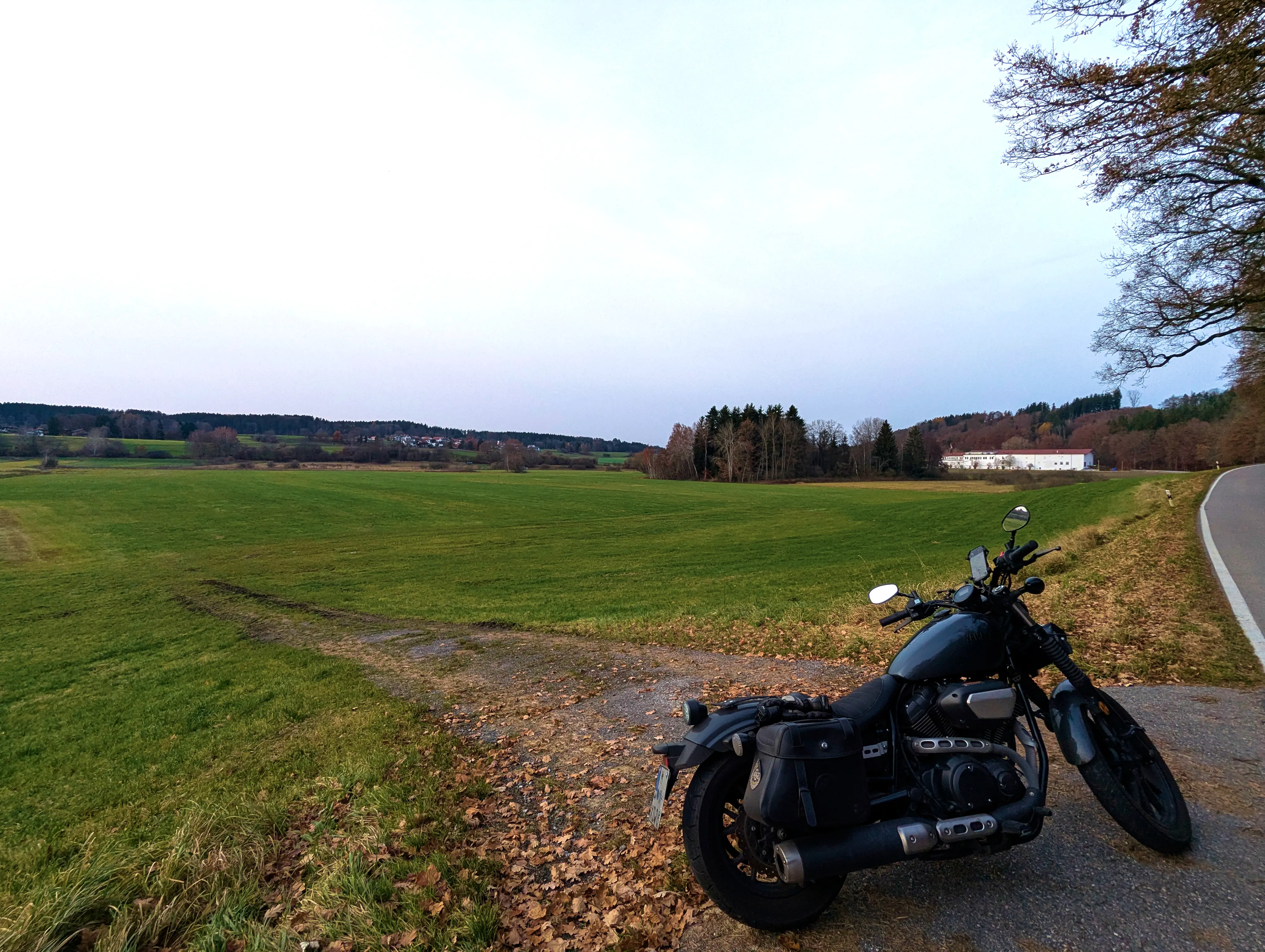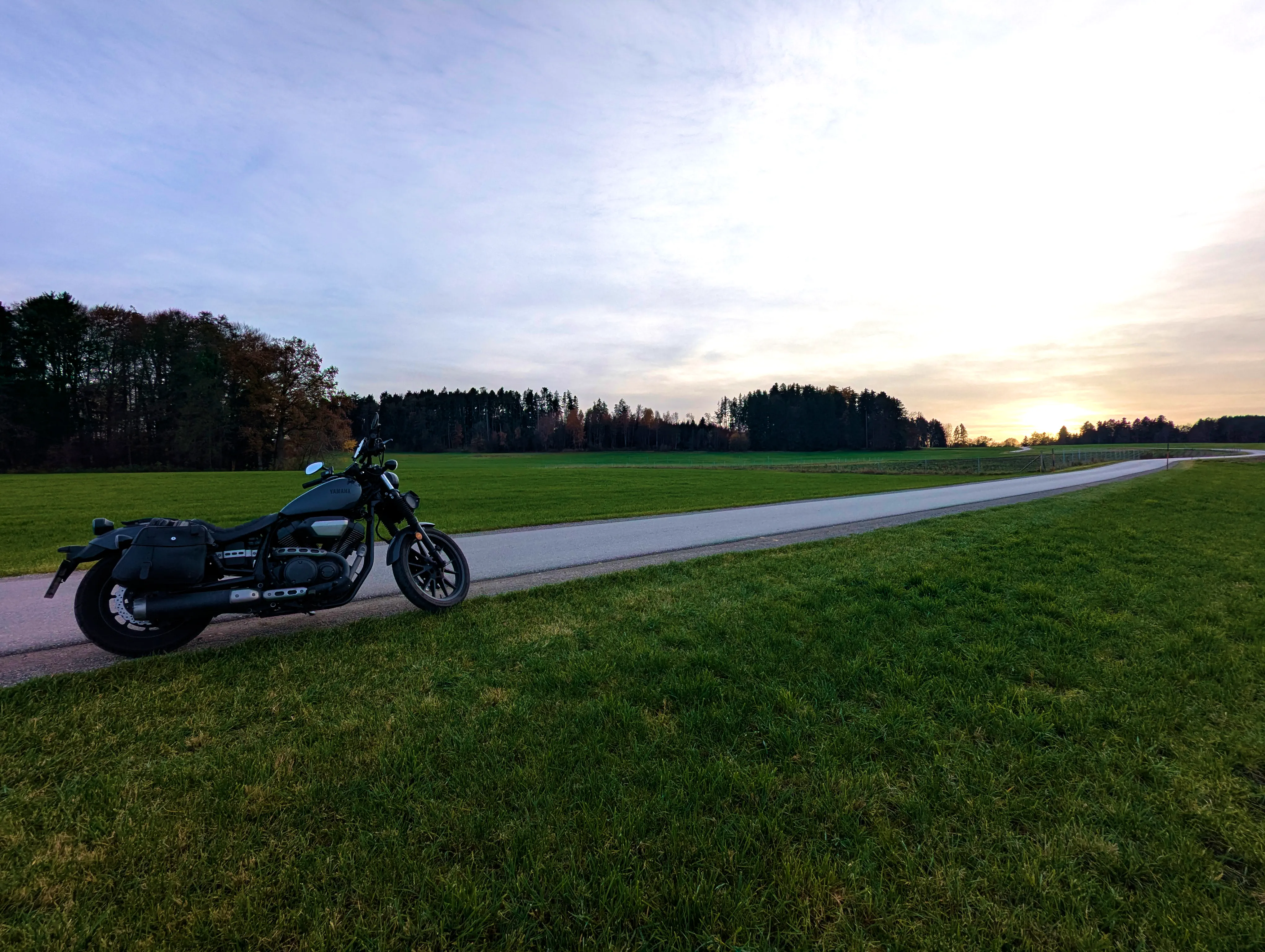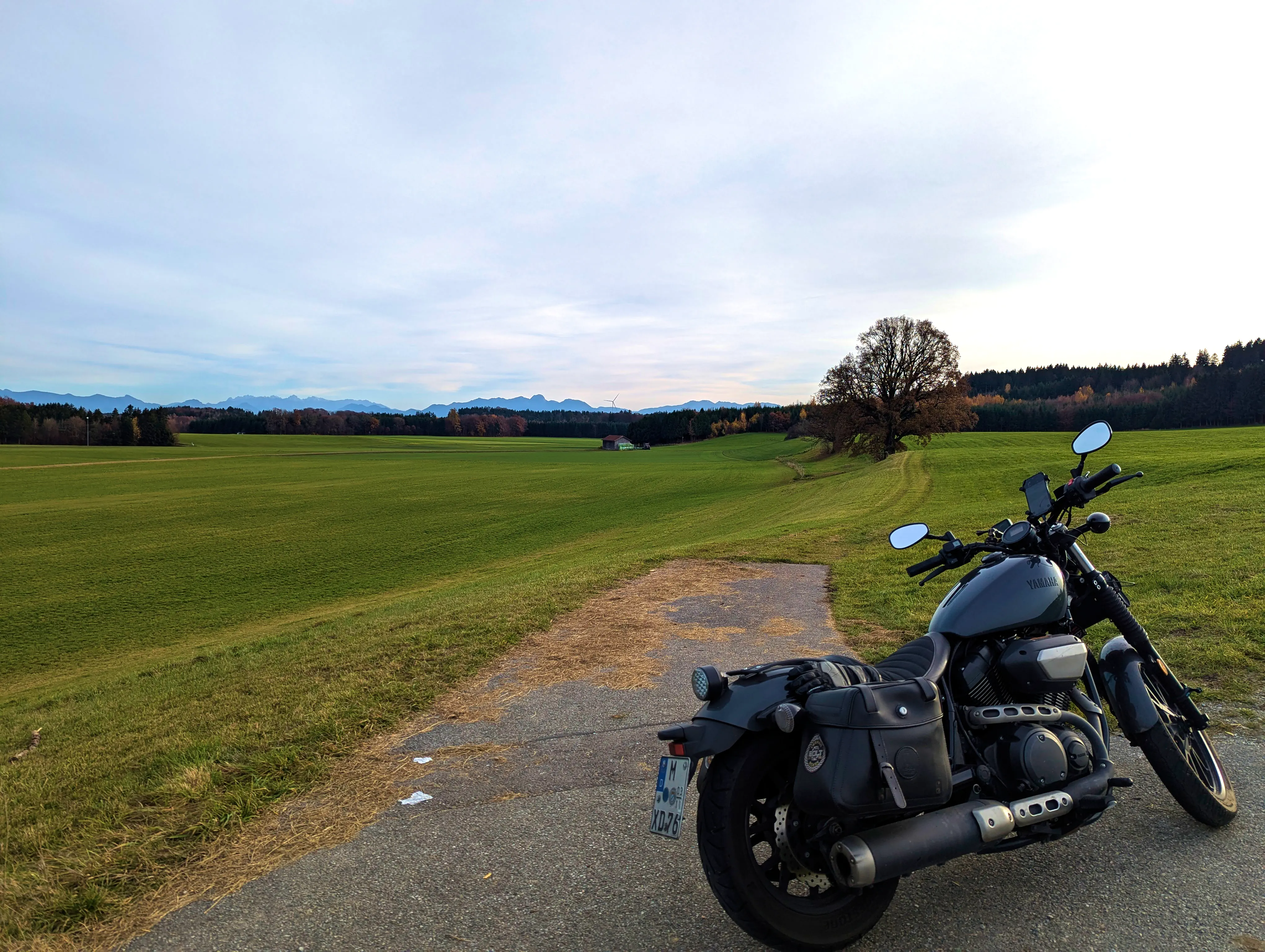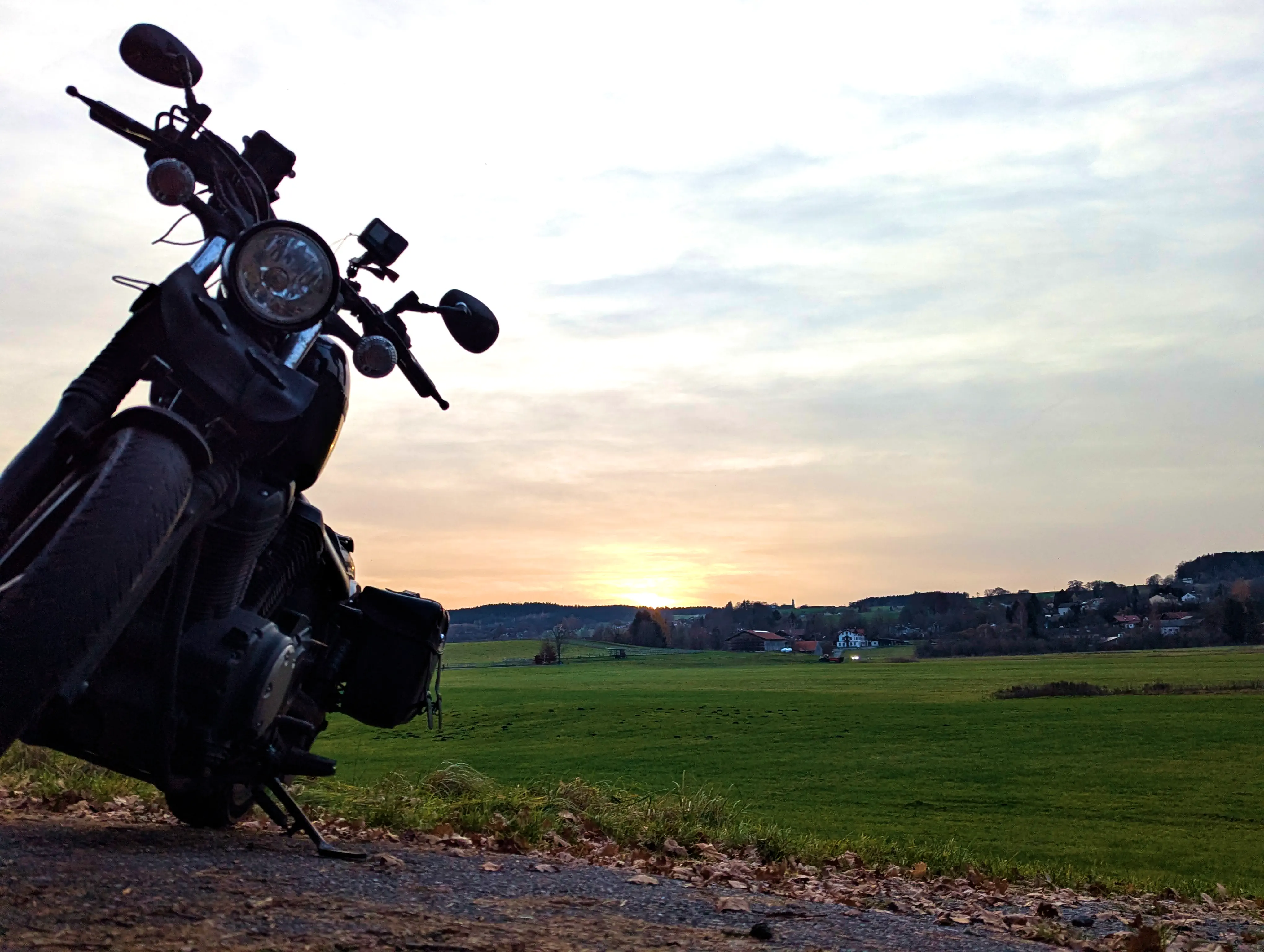 Es ging nun Richtung Aying und weiter nach Süden, über Kleinhelfendorf bis auf Höhe von Feldkirchen-Westerham. Kurz vor Grubmühle hielt ich erneut an, die Sonne stand schön tief hinter dem Motorrad. Natürlich sind auch hier wieder ein paar Fotos entstanden.
