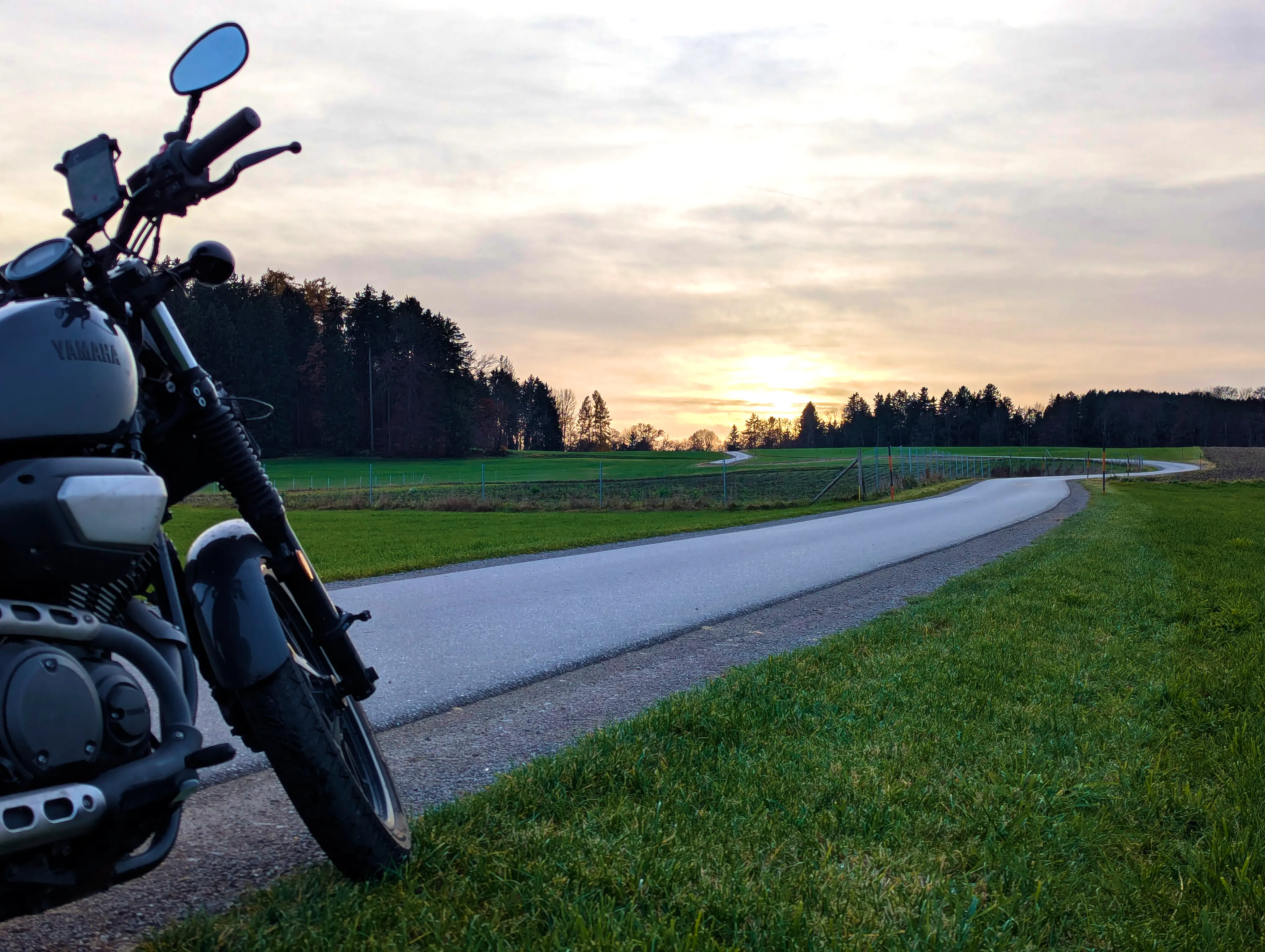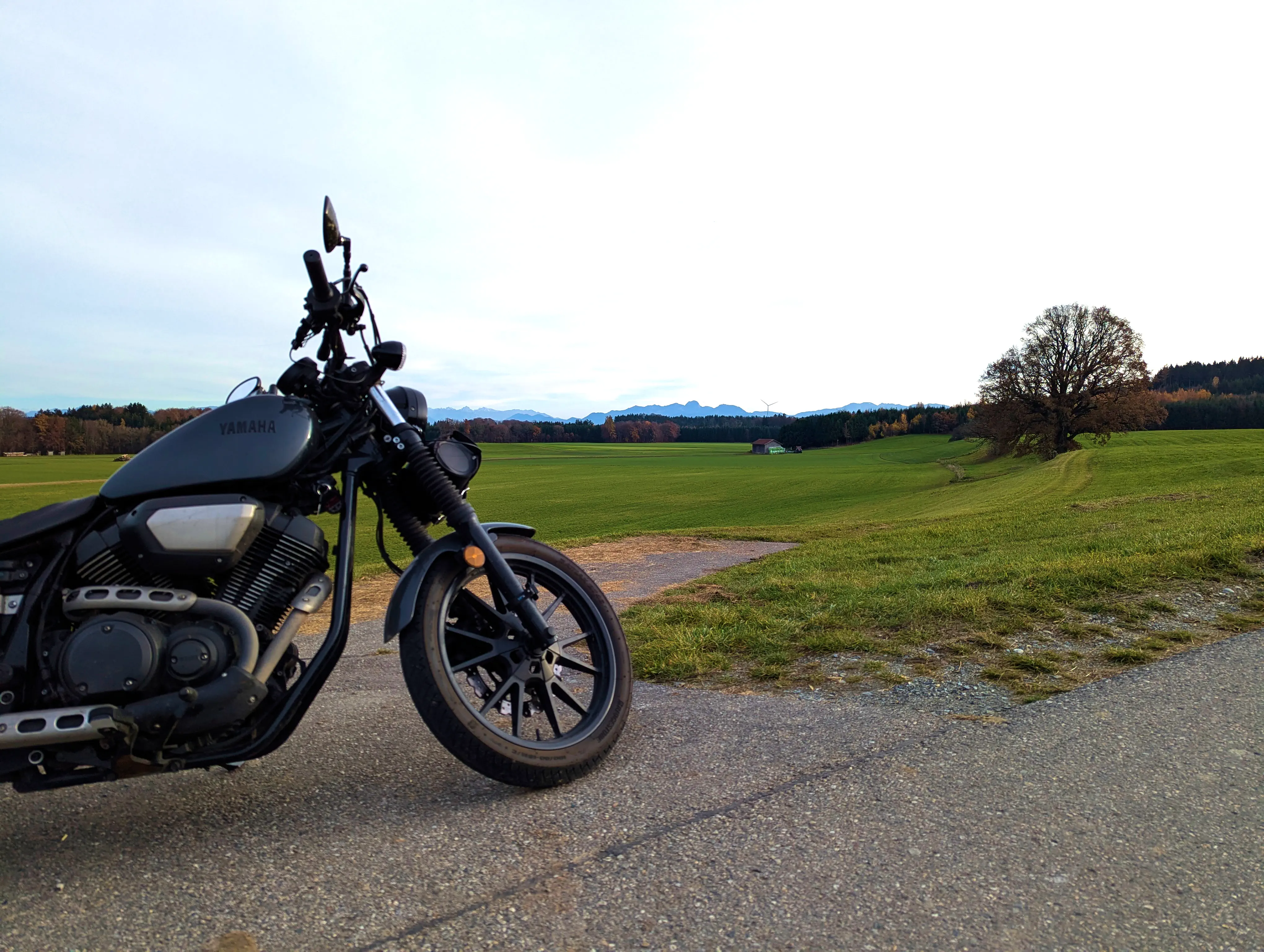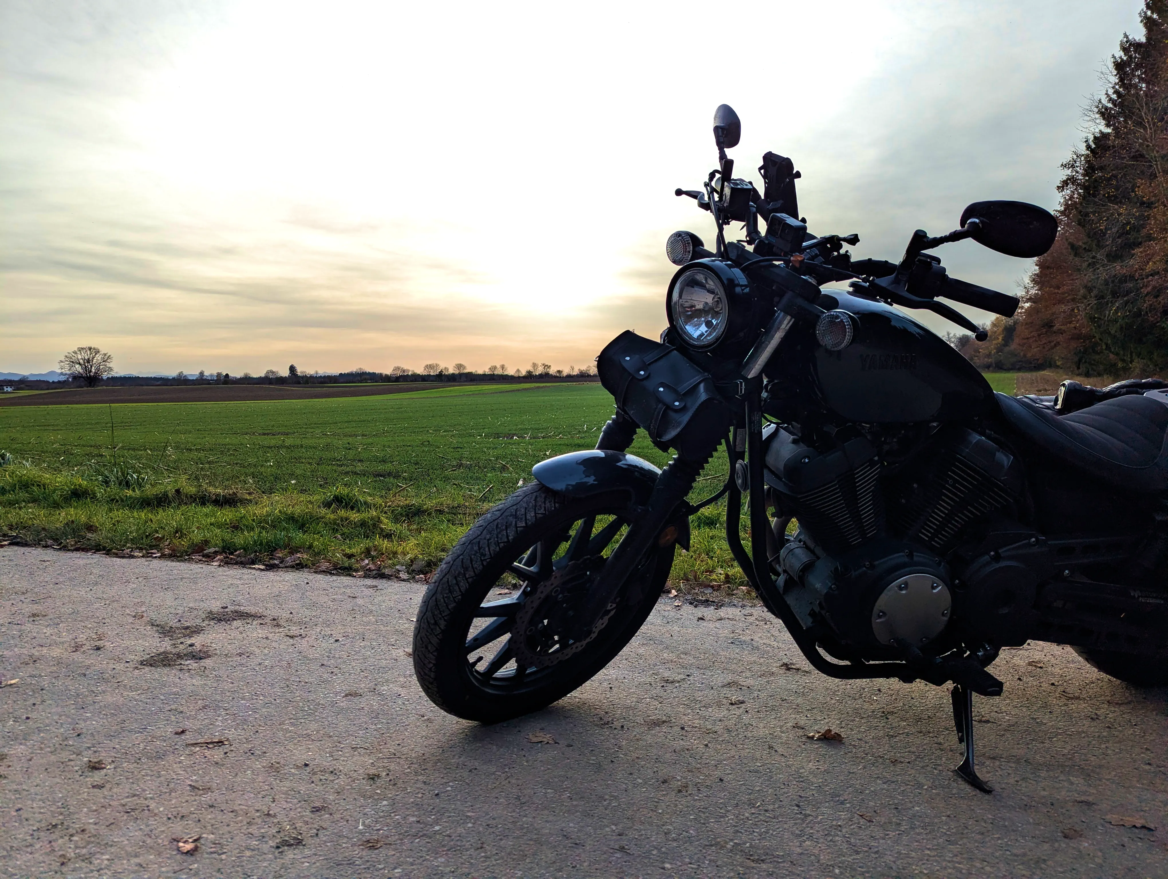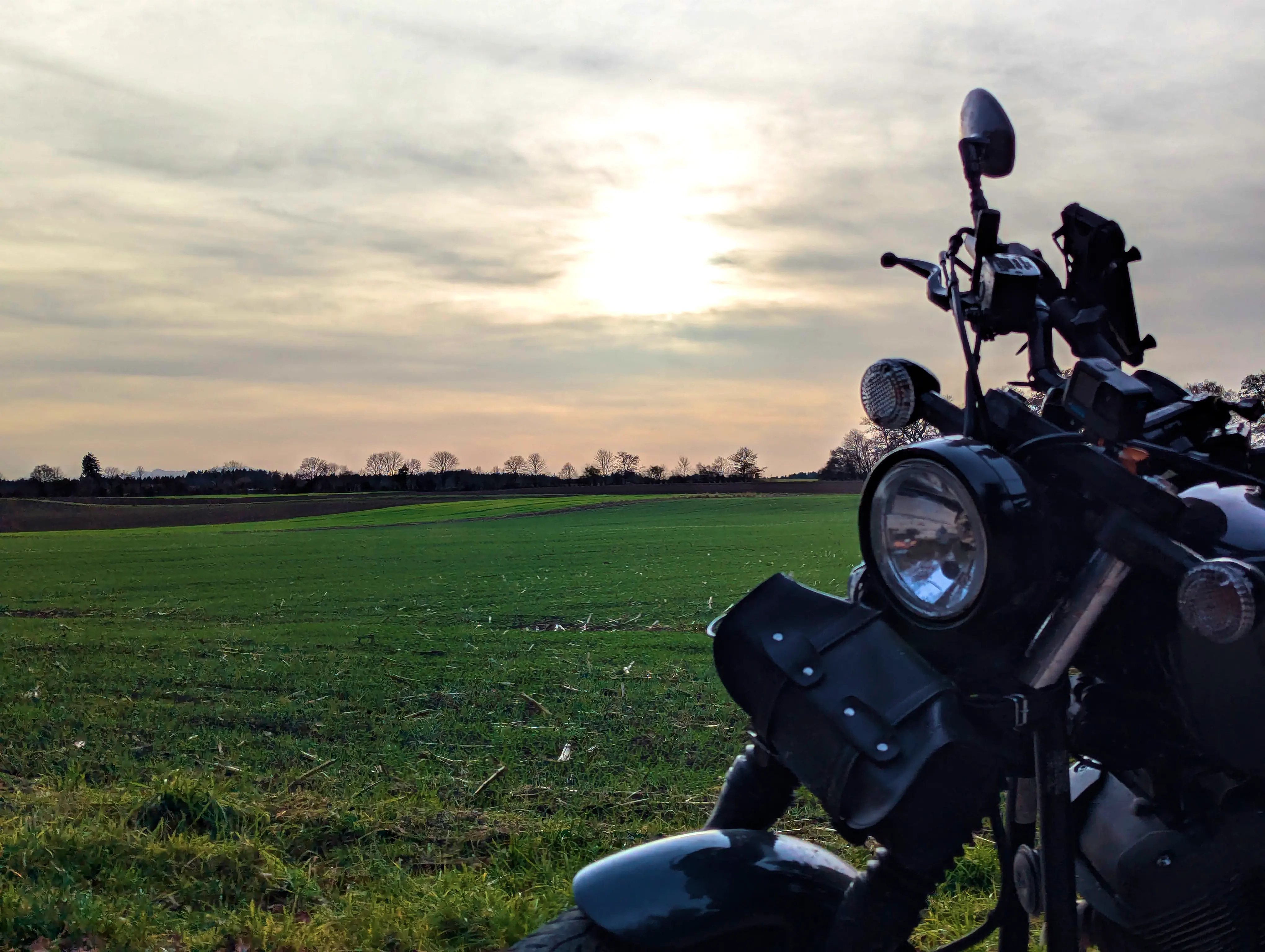 Es ging nun Richtung Aying und weiter nach Süden, über Kleinhelfendorf bis auf Höhe von Feldkirchen-Westerham. Kurz vor Grubmühle hielt ich erneut an, die Sonne stand schön tief hinter dem Motorrad. Natürlich sind auch hier wieder ein paar Fotos entstanden.