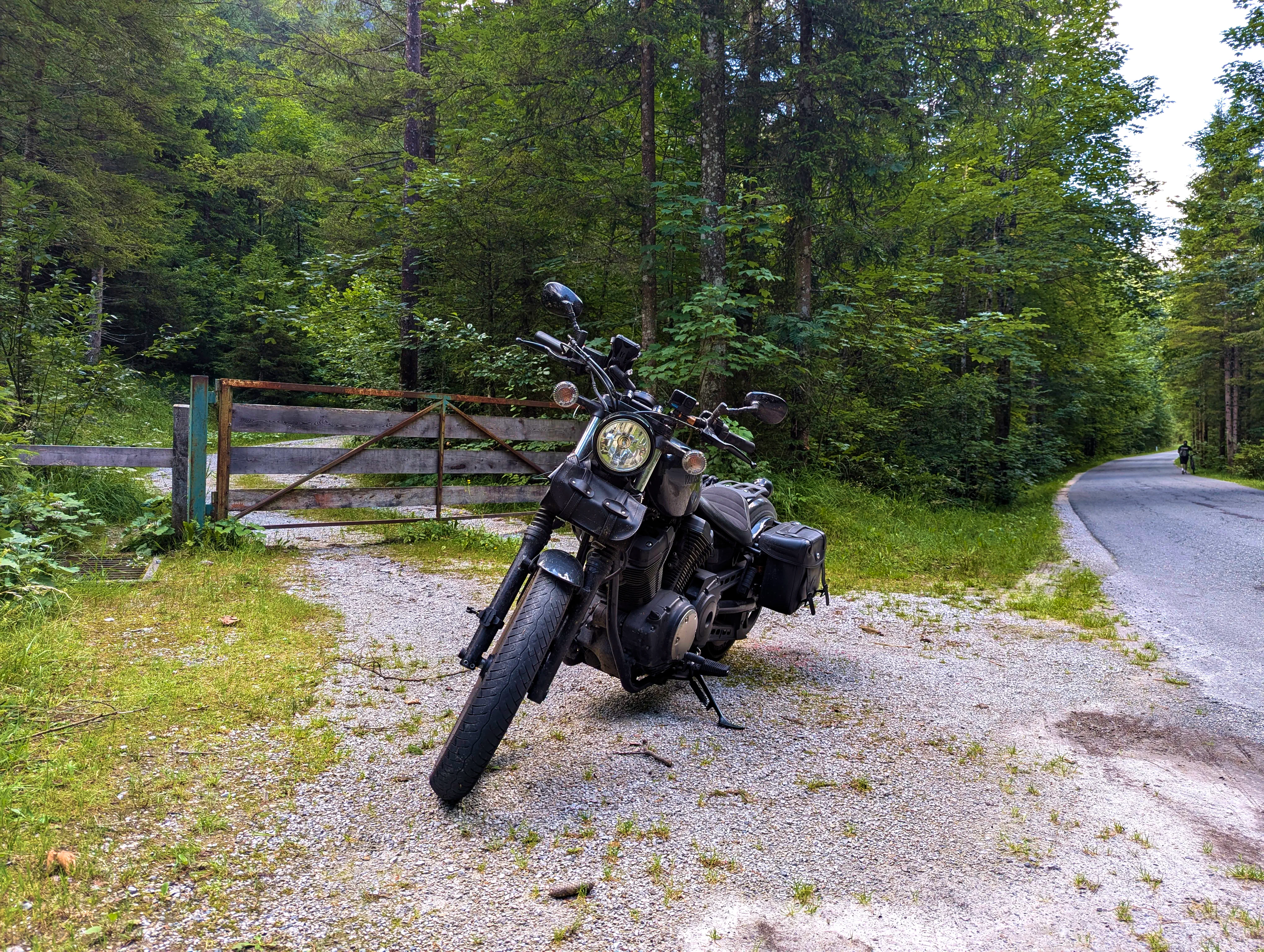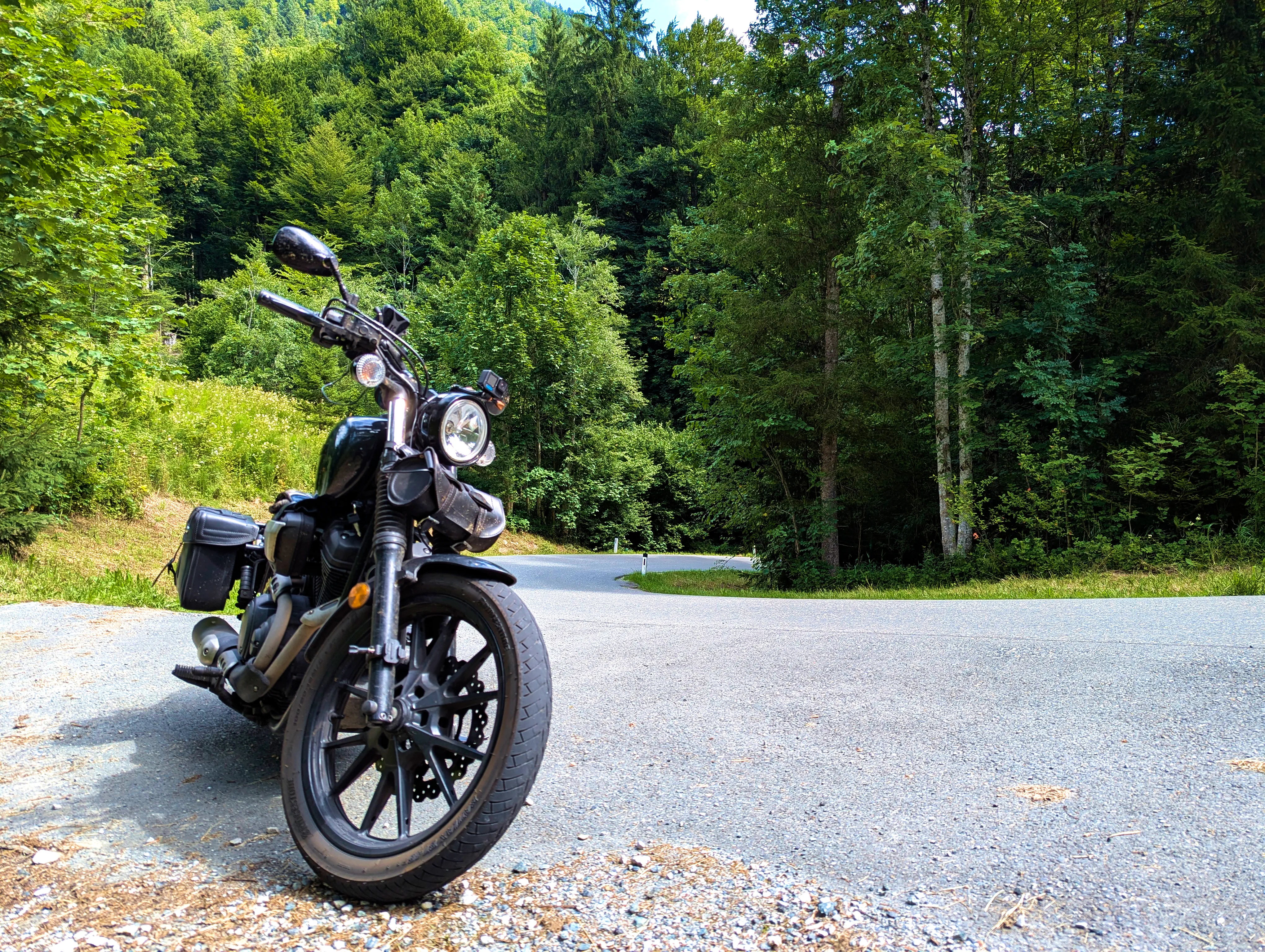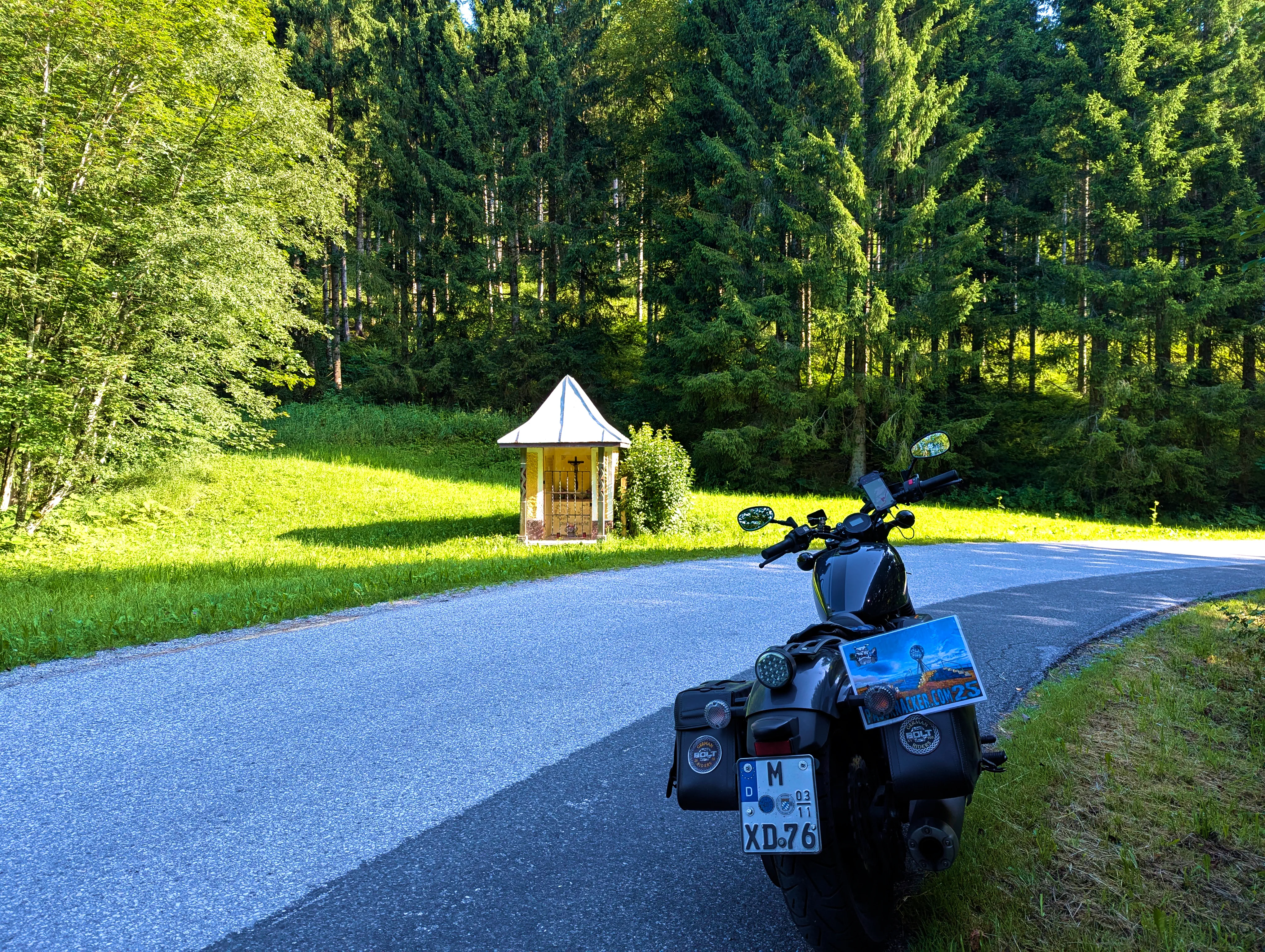 Der erste Passknacker des Tages war nun nicht mehr weit entfernt. Ich hatte bereits 155 Kilometer zurückgelegt, das erste Zwischenziel war jetzt noch ungefähr 13 Kilometer weit weg. Runter von der Autobahn, folgte ich noch ein paar Kilometer einer größeren Straße, bevor ich dann schließlich auf kleine Nebenstraßen einbog, um das erste Zwischenziel zu erreichen. Es war erst kurz nach 8 Uhr morgens, viele der kleinen Straßen lagen noch im Schatten. Dennoch boten sich mir tolle Ausblicke auf die umliegende Natur. Um halb neun war dann der erste Passknacker-Punkt des Tages erreicht, das Nachweisfoto an der kleinen Kapelle im Wald war schnell gemacht. Die letzten Jahre, als ich diesen Punkt anfuhr, drehte ich hier um, um wieder zurück Richtung Golling zu kommen - an diesem Tag fuhr ich geradeaus weiter, Richtung Pichl. Noch ein Stück weiter, und ich hätte den Lienbachsattel bzw. die Postalmstraße befahren können - dafür fehlte mir an diesem Tag jedoch die Zeit. Trotzdem war der Weg weiter Richtung Pichl und dann etwas unterhalb über die B162 zurück Richtung Golling sehr schön zu fahren, besonders das Stück bis Pichl.