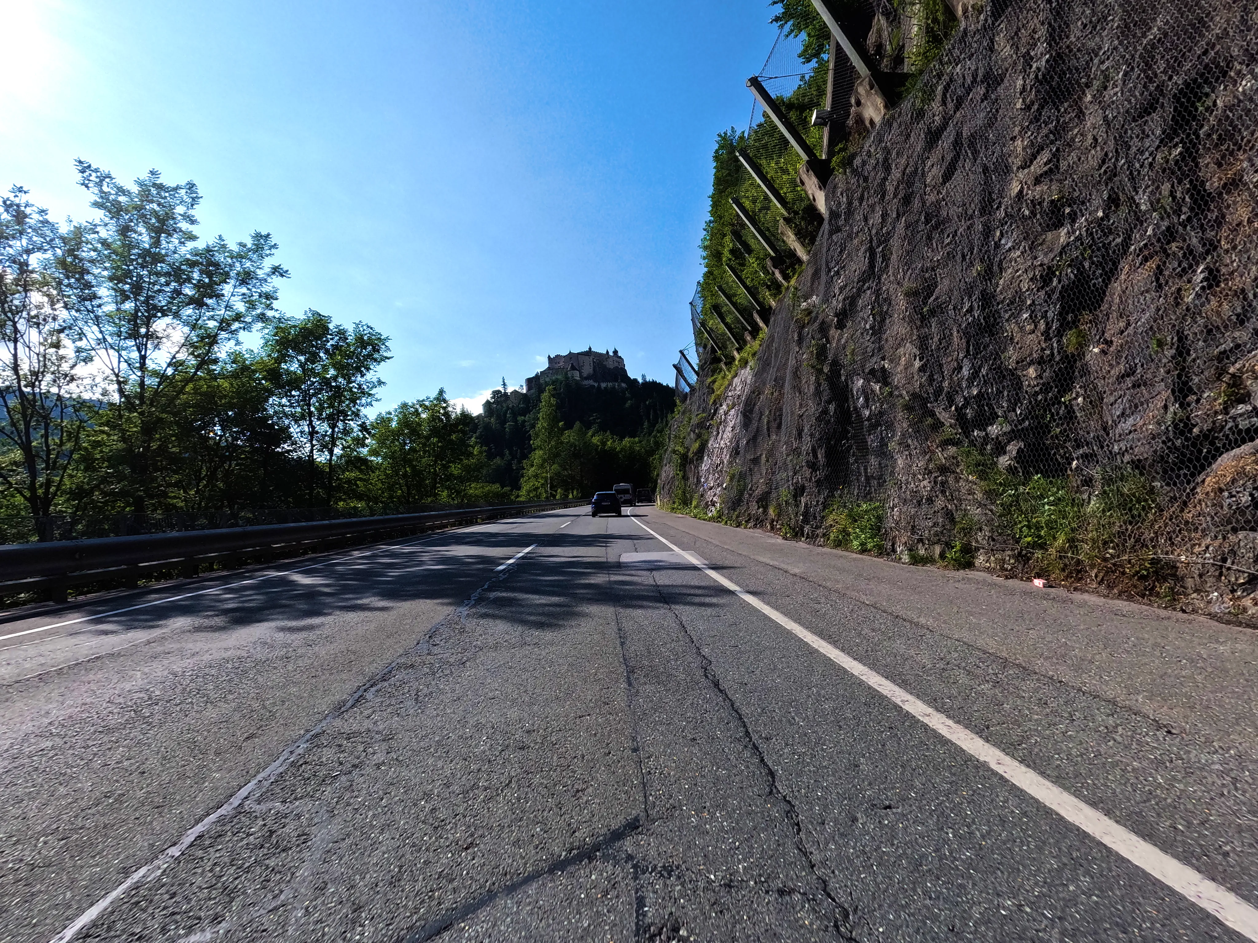 Mit vollem Tank ging es zum nächsten Ziel, dem Pass Lueg. Dieser war über die B159 nur 3 Kilometer von der Tankstelle entfernt. Ich hielt in der Parkbucht am Tunnel mit Blick auf das Hotel, um mein Nachweisfoto zu knipsen. Von hier aus ging es weiter über die B159 in Richtung Süden, vorbei an der Festung Hohenwerfen bis Bischofshofen.