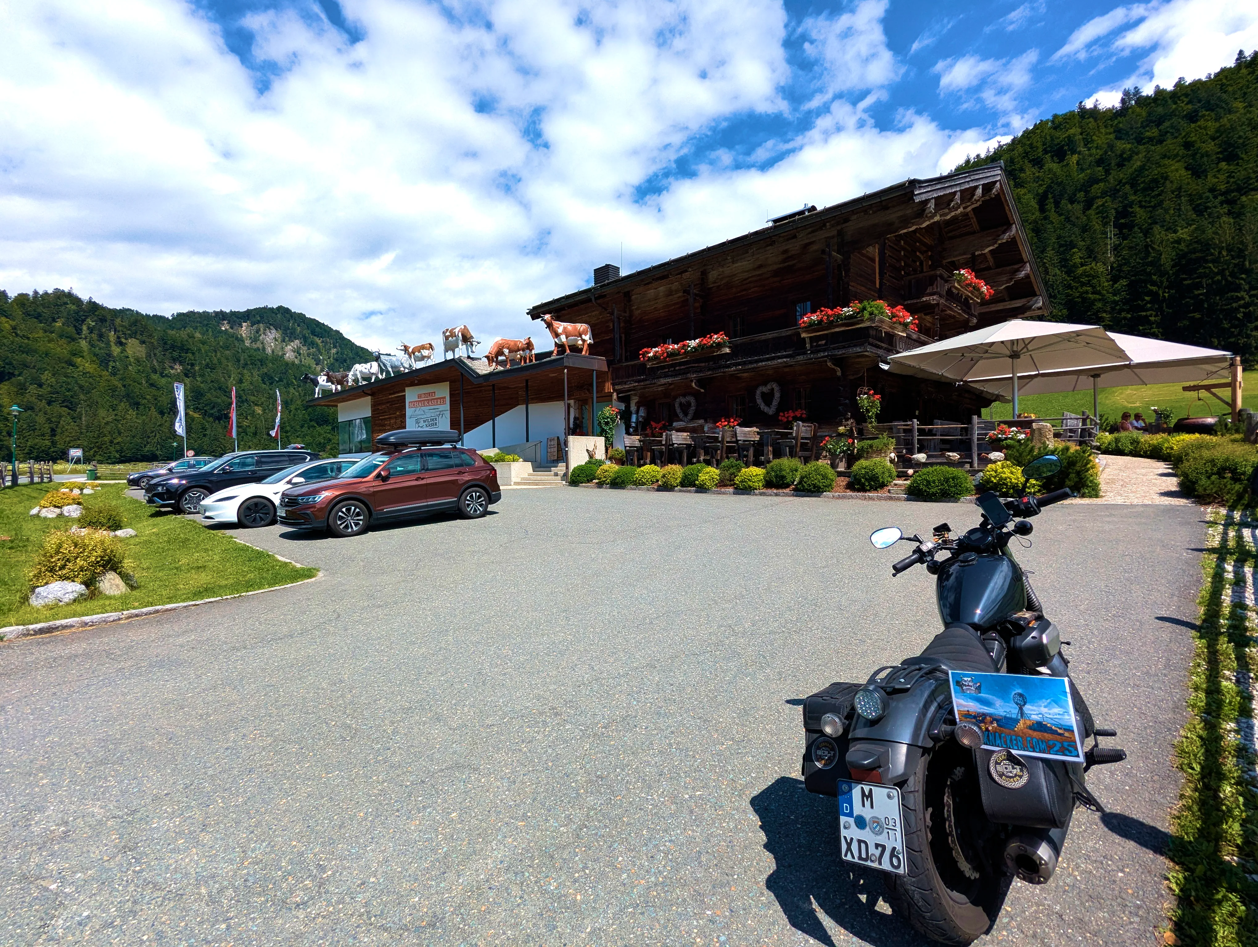 In Hochfilzen verließ ich die B164, um ein Stück Richtung Norden zu fahren. Es ging über kleine Nebenstraßen vorbei am Wiesen- und am Pillersee. An letzterem hielt ich dann auch für ein paar Bilder an. Wirklich idyllisch. Es ging weiter bis Waidring, hier bog ich auf die B178 nach Kirchdorf ein. Und hinter Kirchdorf wartete bereits der vorletzte Passknackerpunkt dieser Tour auf mich: Huberhöhe / Gasteig. Als Nachweismotiv diente mir an diesem Tag nicht das Ortsschild, sondern die Schaukäserei. Über die B176 verließ ich den Ort und folgte dieser nach Norden. Durch Kössen ging es in Richtung deutscher Grenze.