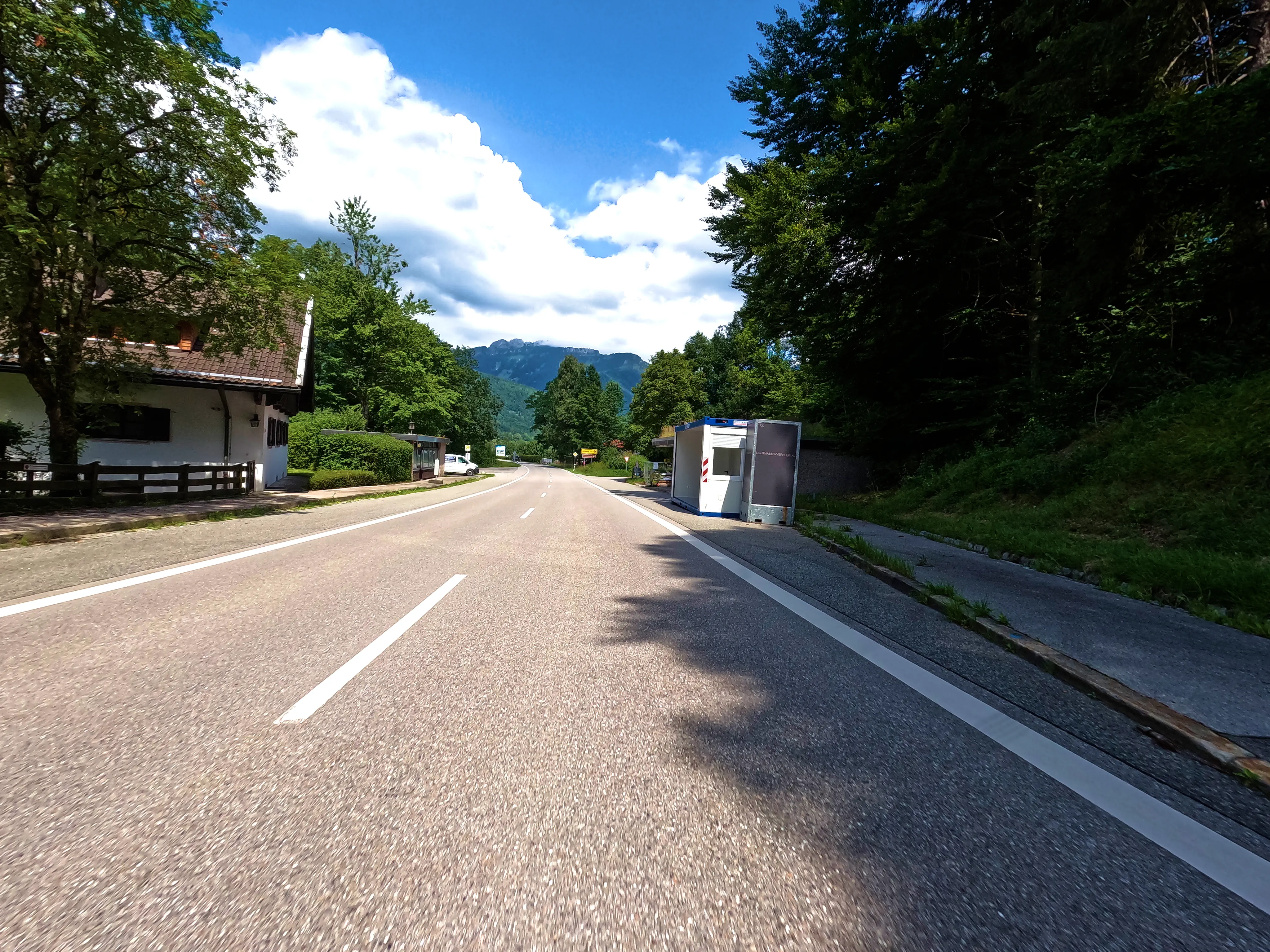 Als ich den Felstunnel durchfahren hatte, war ich bereits in Bayern. Ein paar hundert Meter weiter stand ein Container, der wohl eine Grenzkontrolle darstellen sollte - hier war jedoch niemand, somit wurde auch niemand kontrolliert. Für mich ging es nun wieder nach Hause, diesmal allerdings ohne Autobahn. Ich fuhr über Marquartstein, Grassau, Bernau und Prien am Chiemsee vorbei, umfuhr Bad Endorf und kam schließlich zwischen Höslwang und Halfing mal wieder am Weiler »Radl« vorbei. Am Schild stand auch wieder ein Fahrrad. Bei Griesstätt ging es über den Inn, anschließend noch durch Grafing und von Glonn an über die Hausstrecke zur heimischen Tankstelle.